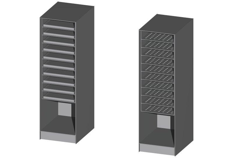 - vnitřní vvybavení, 10x pevná police (84 otvorů Ø30mm), 10x vanička nerez s vnitřním vyvařením (výška vaničky 20mm)